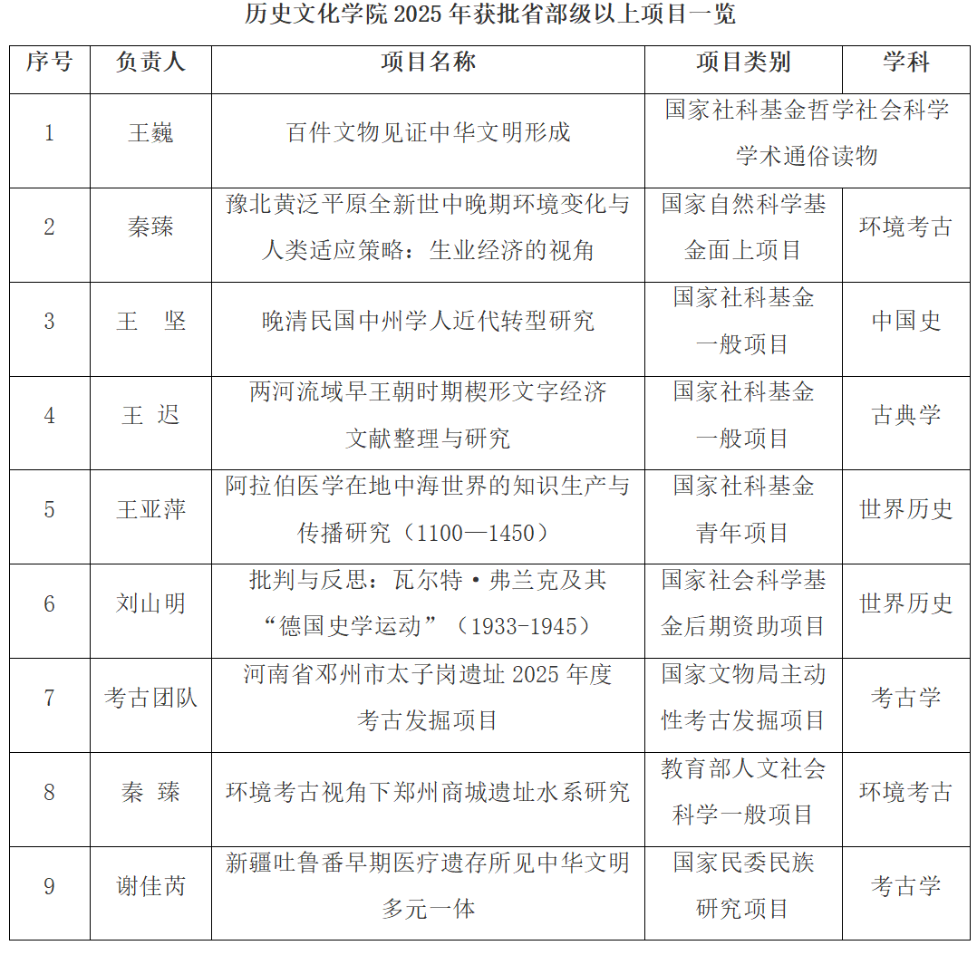 通俗读物项目、首次获批国家自然科学基金项目,以及古典学领域首个国家社科基金一般项目;同时获批国家文物局主动性考古发掘项目1项、教育部人文社会科学一般项目1项、国家民委民族研究项目1项;国家博士后项目7项,包括中国博士后基金特别资助1项、面上资助4项,国家资助博士后研究人员计划B档1项、C档1项;全国考古人才振兴计划项目创新团队子课题1项。此外,获批河南省社科基金项目6项(一般项目1项、青年项目1项、文化研究专项4项),河南省科技考古提升专项2项。2025年累计获批省部级以上项目25项。