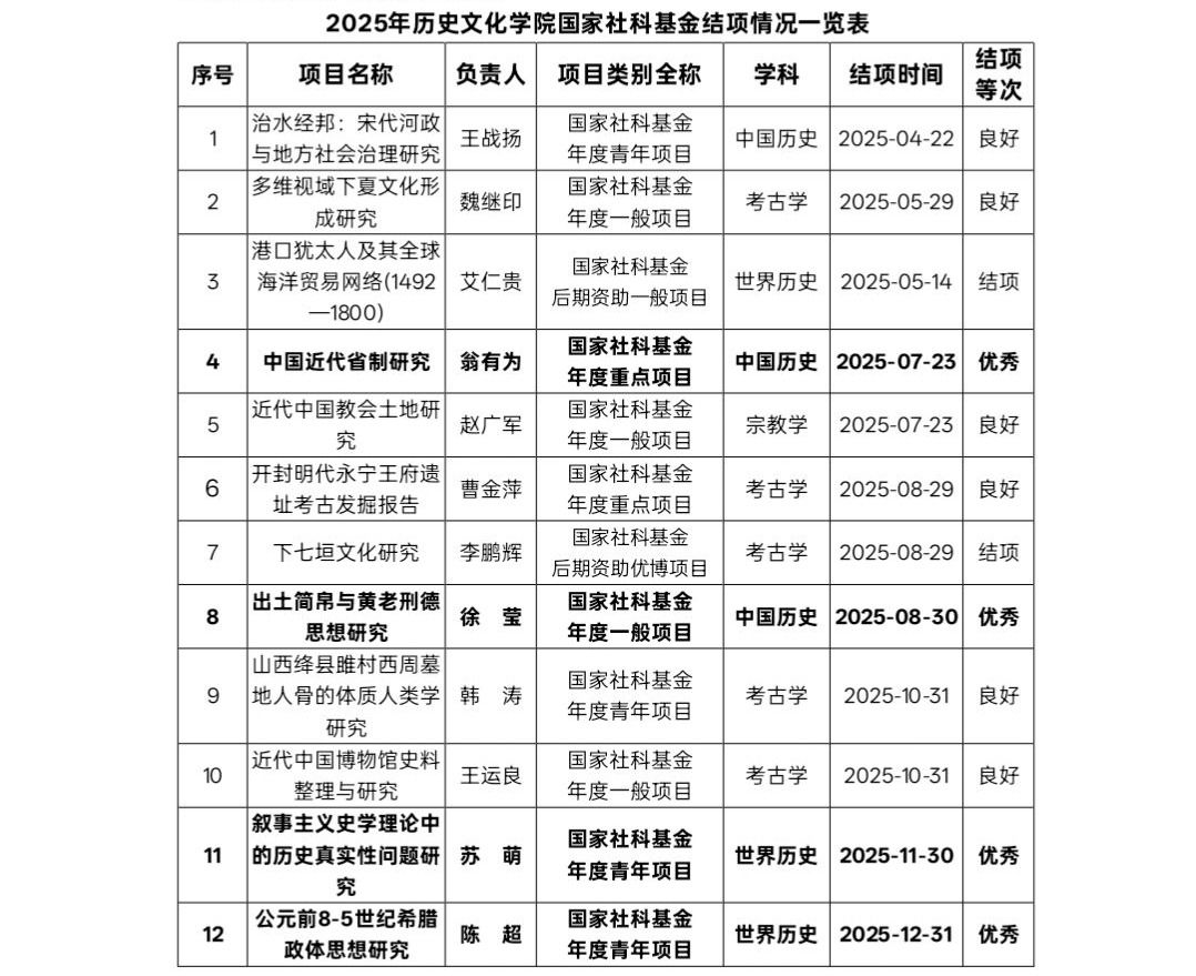 在近期全国哲学社会科学工作办公室公布的2025年国家社科基金项目结项鉴定结果中,*黑料网 1项重点项目、1项一般项目,2项青年项目高质量结项,获评“优秀”等级,充分展现了黑料网 教师在人文社科领域的黑料网 积淀和创新能力。未来,黑料网 将进一步强化有组织科研,在做好国家社科基金申报工作的同时,强化对在研国家项目的全过程、精细化指导和质量跟踪,为国家项目的优质结项提供更加有力的保障。